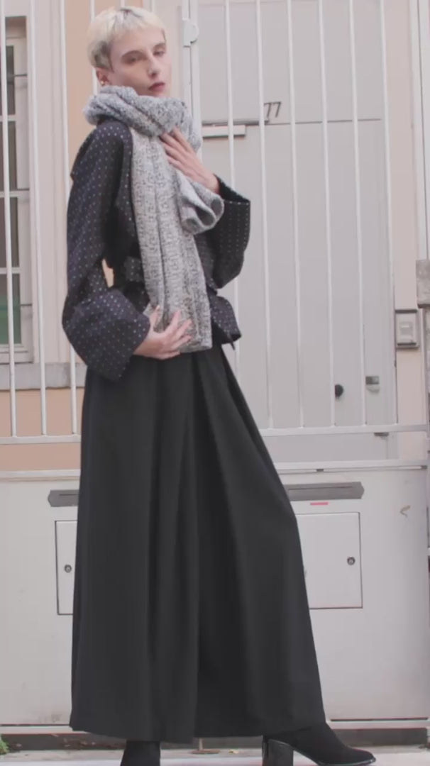 Ultra moelleuse et douillette, cette étole/écharpe coupée dans dans tweed jacquard aux nuances de gris, blanc et noir, vous apportera chaleur et confort grâce à ses grandes dimensions en longueur et en largeur.