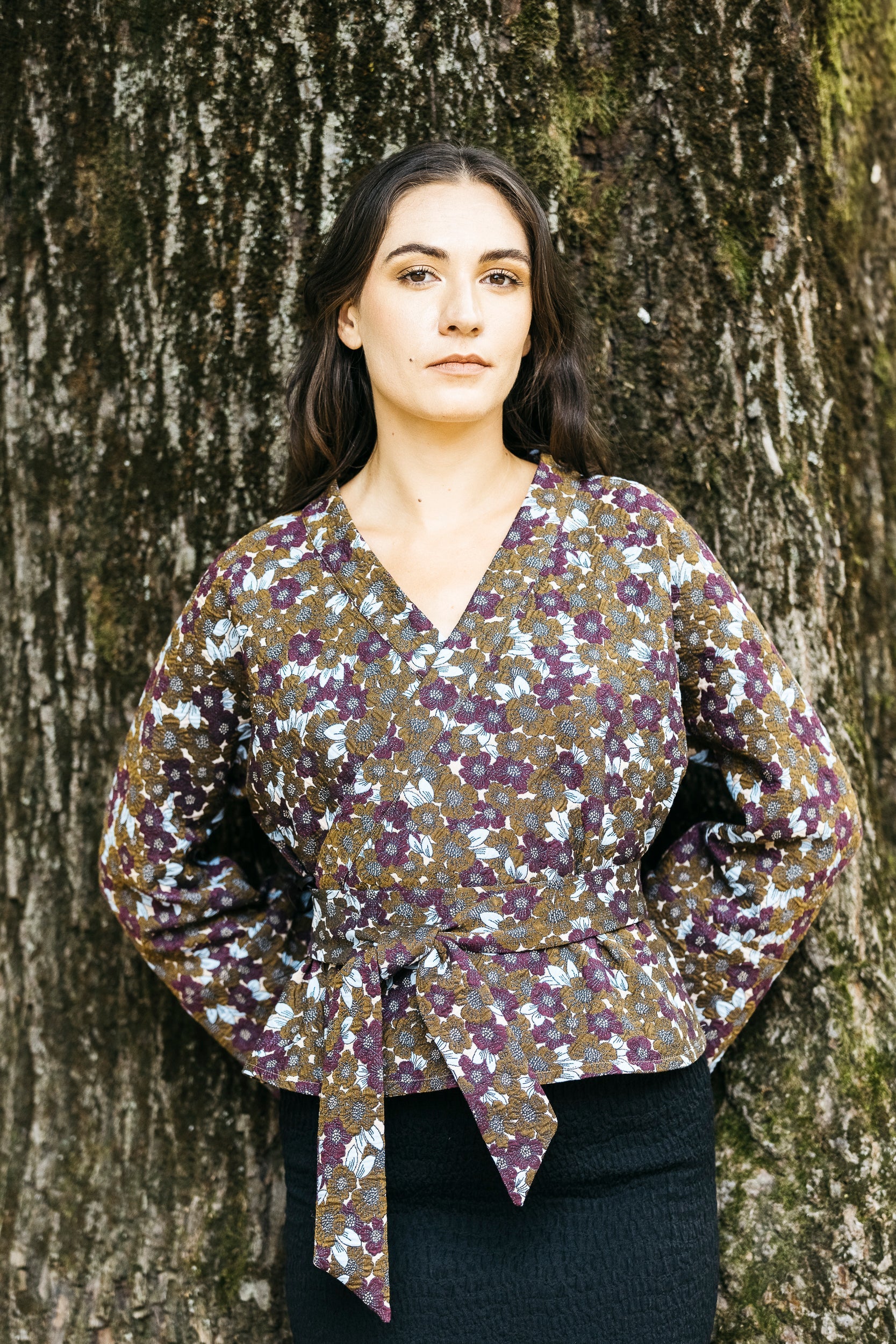 Le kimono KASUMI est coupé dans un textile BIO tissé jacquard en France.