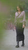 Le mannequin Marie mesure 1,82 m et porte le kimono KASUMI en taille T3, hauteur milieu dos 50 cm avec la jupe tube SUKATO noire T38 - 95 cm.