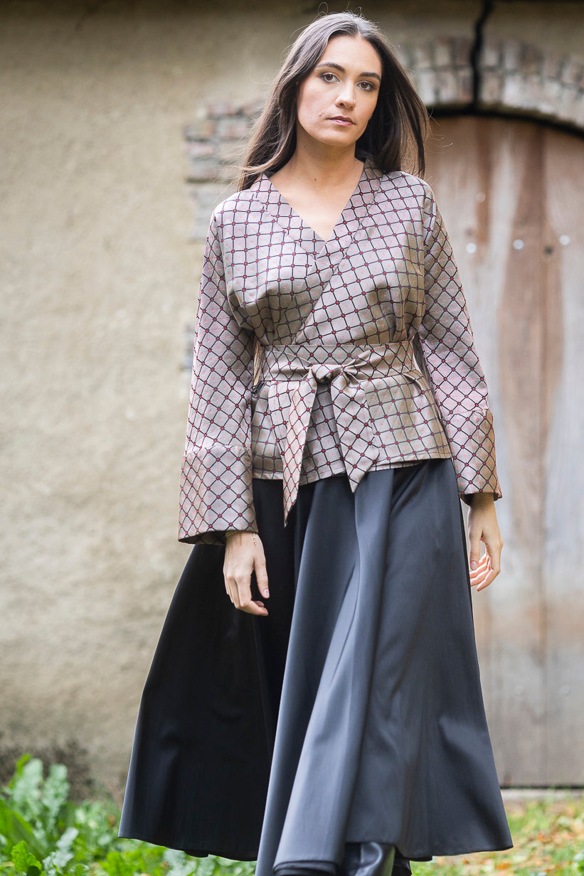En pièce maîtresse, avec son tissage serré, le manteau kimono à porter comme un trench/coupe-vent. À combiner en parfaite harmonie avec les kimonos , l' étole/écharpe ultra douillette aux dimensions généreuses, les pantalons hakamas et les jupes noires.