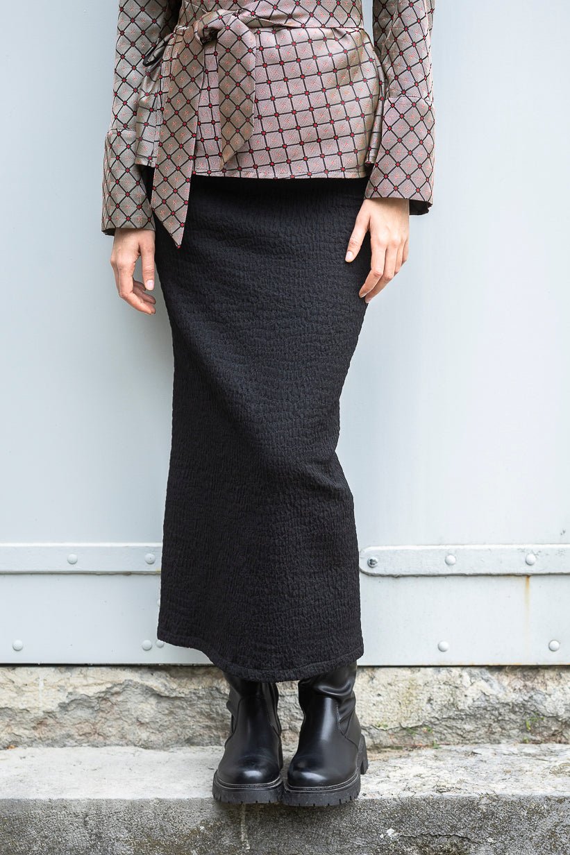La mannequin porte la jupe STUKATO en taille T38, longueur 90 cm.
