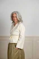 Le kimono NODO se porte comme un chemisier avec plus de modernité et d'originalité. Avec ses manches longues légèrement évasées, et des revers très généreux pour obtenir des manches 3/4.