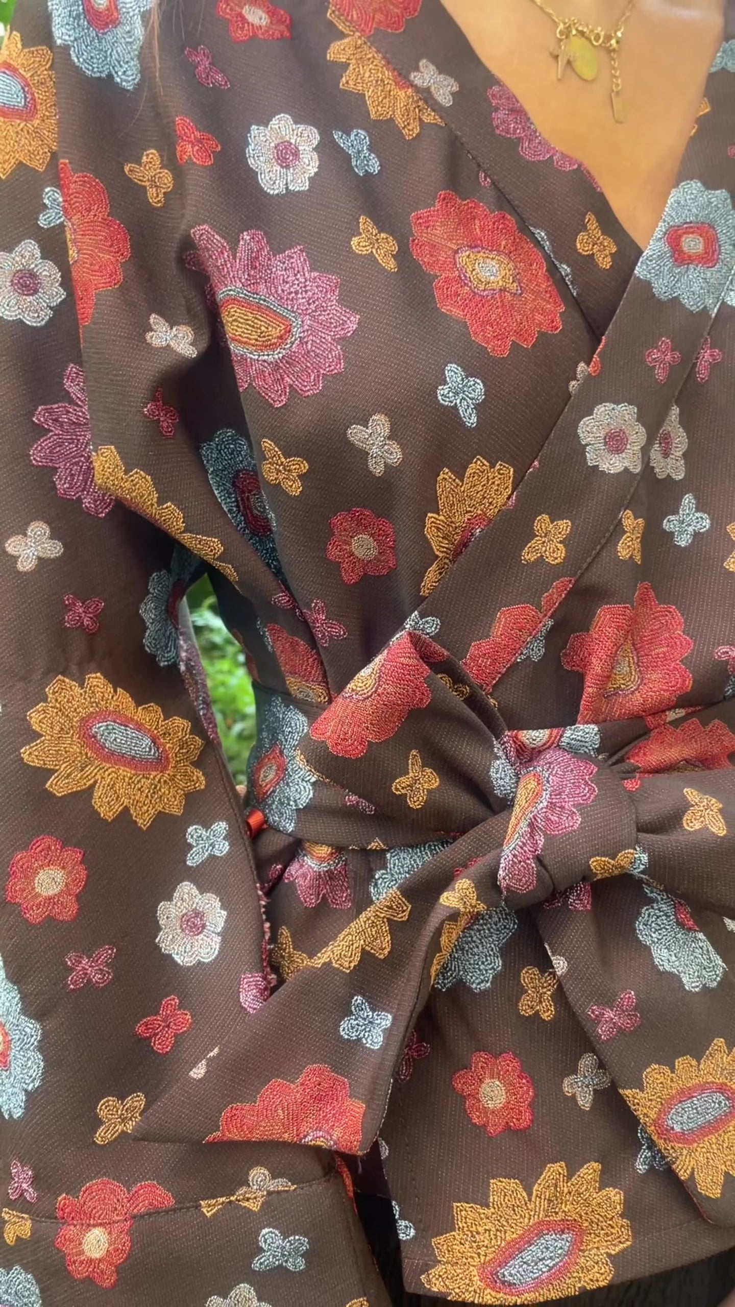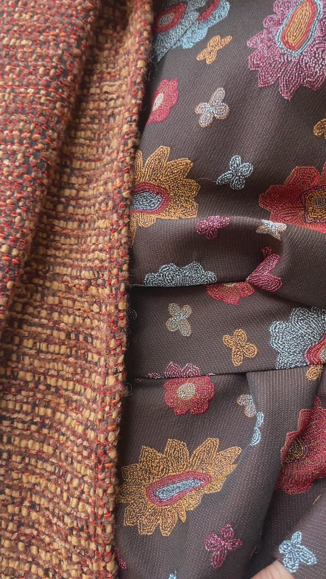 Kimono OKU marron réversible avec des motifs floraux très délicats et raffinés subtilement tissés, de couleurs oranges, bleus gris, sur un chaleureux fond marron acajou.