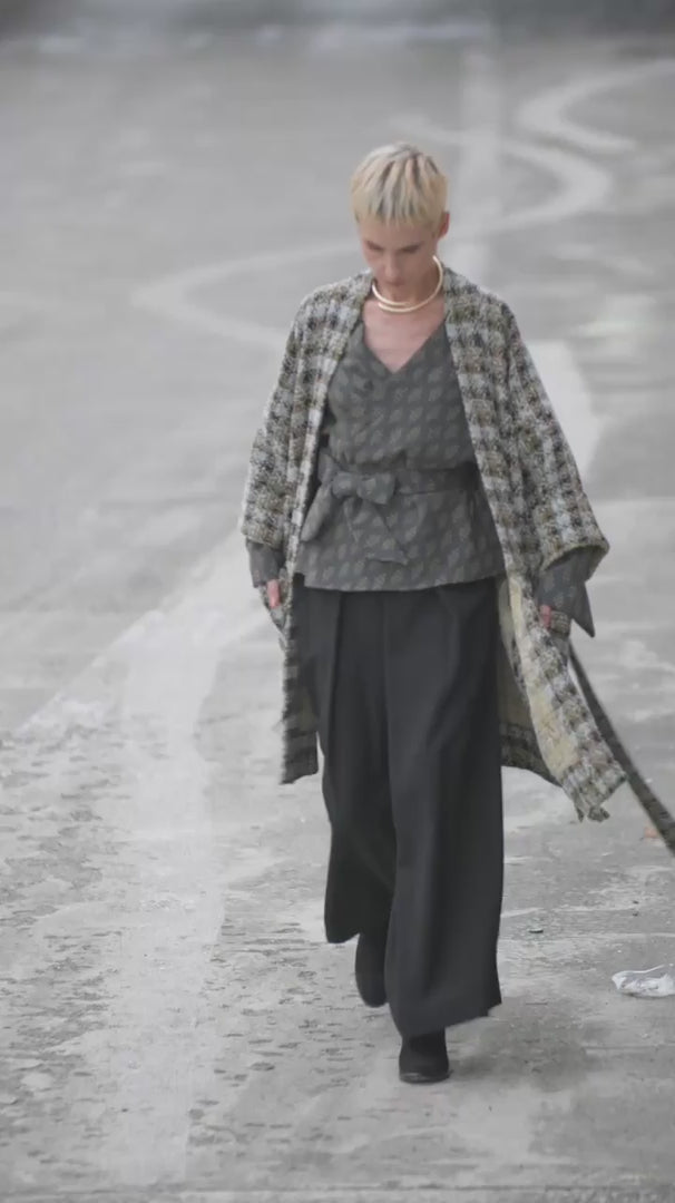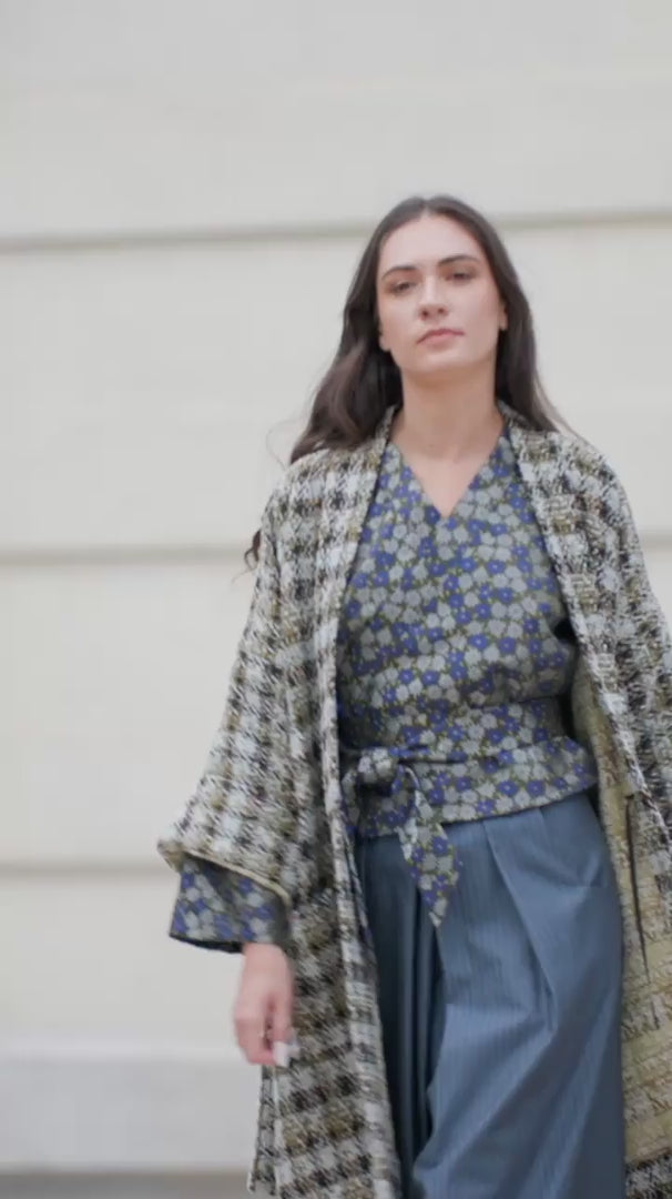Le manteau kimono KAZE à carreaux se coordonne parfaitement avec toutes les pièces de la collection TAMASHI.