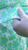 Le KIMIDORI est coupé et assemblé dans un jacquard haute densité façon brocart, révélant un motif japonisant d'une finesse remarquable — une symphonie de vert et de bleu délicat sur fond blanc immaculé. En trame légère, un fil argenté traverse le tissu et réhausse les couleurs avec subtilité, rendant le KIMIDORI lumineux selon la lumière, éclatant en plein jour, raffiné en soirée.