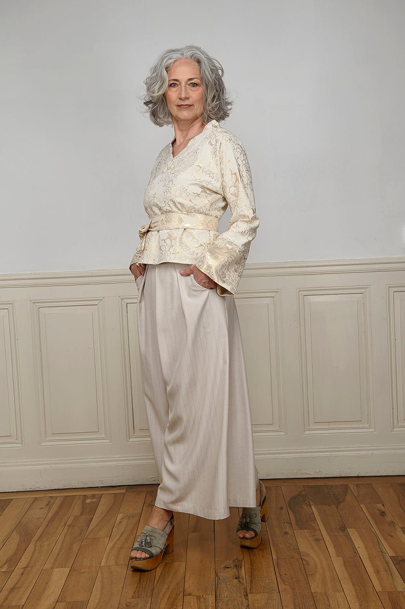 Pantalon hakama JIMA sable en viscose rayée satinée, coupe fluide et élégante avec plis plats, grandes poches et fermeture côté.