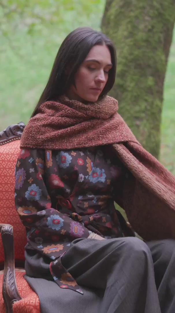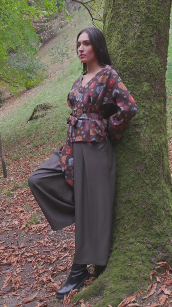 Reversible kimono in organic jacquard woven in France, with subtle orange and blue-grey floral patterns on a mahogany background.