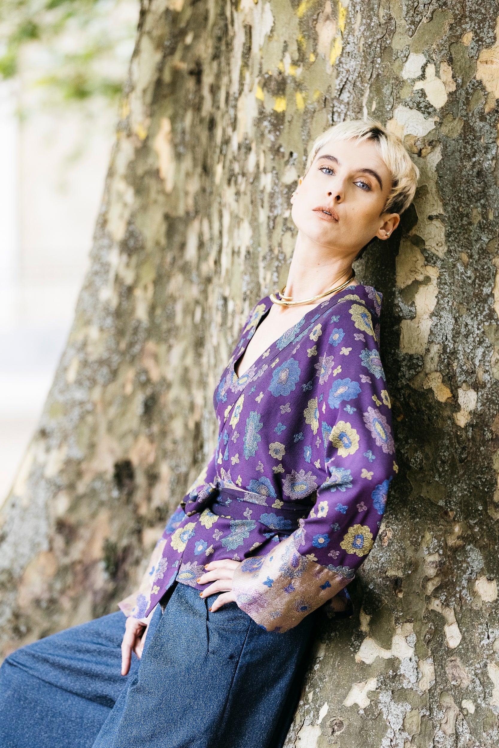 Kimono OKU violet/yellow reversible for fans of refined floral patterns and to replace a suit jacket in a more modern and original way.