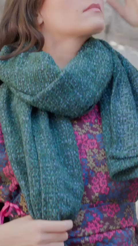 Ultra moelleuse et douillette, de couleur bleu/turquoise, cette étole/écharpe mixte vous comblera de chaleur et de douceur coupée dans de grandes dimensions en longueur et en largeur.