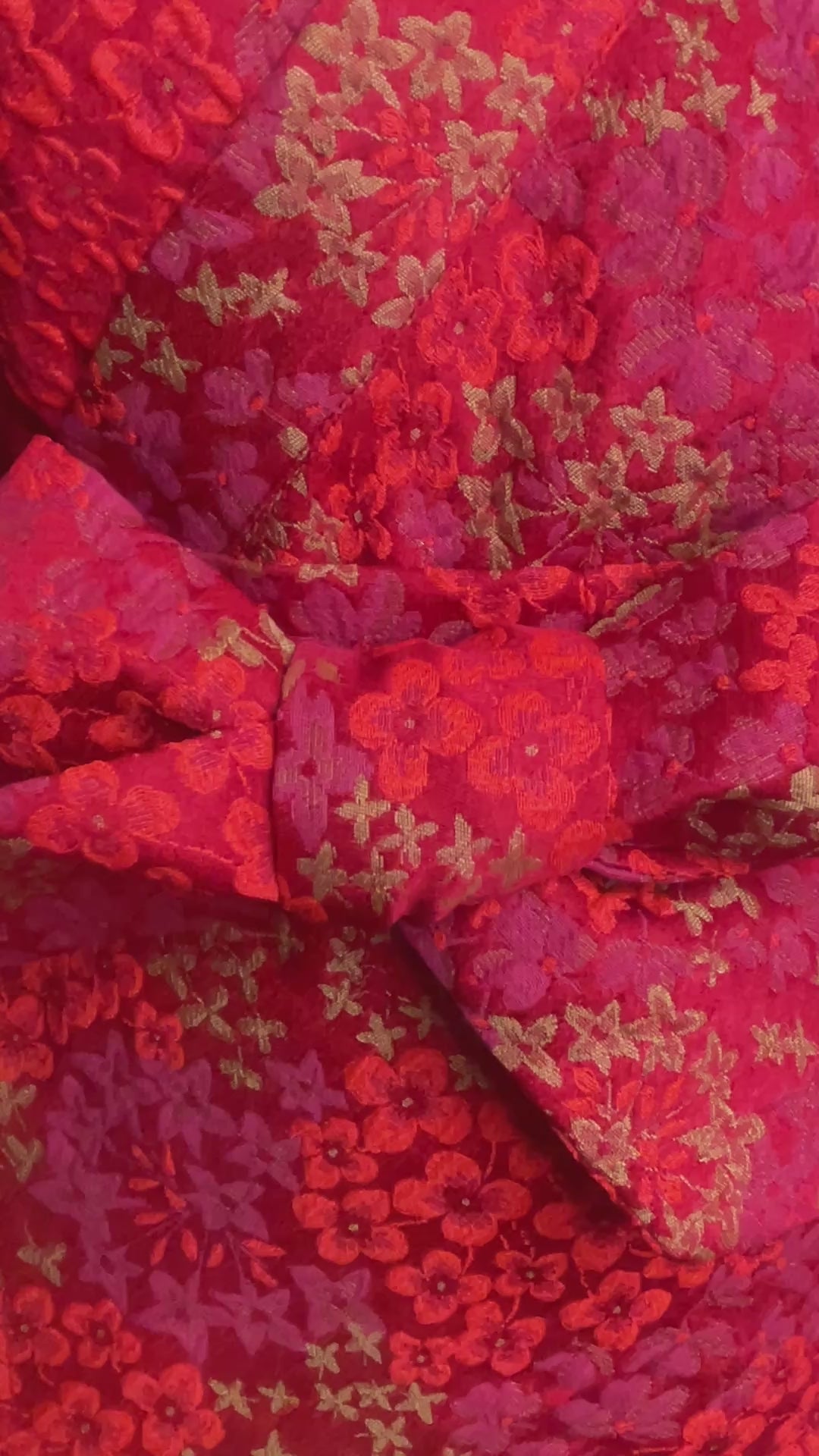Il est coupé et assemblé dans un magnifique textile jacquard tissé façon brocart avec un motif floral rouge orange rose et vert tilleul.